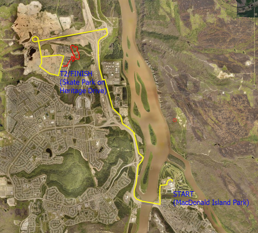 See the 2017 Bike Course above. Racers will swim in the pool at MacDonald Island Park. Transition 1 is in the parking lot behind MacDonald Island Park (close to the golf course). Racers will cycle along the MacDonald Island causeway, turning right onto the bridge that joins Highway 63 North. Keeping to the shoulder on the Northbound side, racers will go around the high-load bypass of Thickwood overpass, and then take the turnoff to Northstar Ford. They will follow this service road past Spruceland Lumber, all the way to Taiganova. At Taiganova racers will turn left, and then quickly right, to merge back onto Highway 63 North. Staying in the right hand shoulder, racers will exit onto the Parson's Creek overpass heading West. Rider's will then turn south/left on Coventry Drive. The square around Parson's Creek will be completed 3.5 times. On the fourth passing of the skate park on Heritage Drive, riders will turn left into the parking lot of the skate park. This will be Transition 2.
